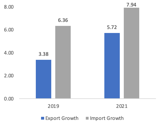 The COVID-19 pandemic has led to an increase in digital use in ASEAN. Taking a sample of six member states (Indonesia, Malaysia, Philippines, Singapore, Thailand, and Viet Nam), there was an increase in the average growth of export in digitally deliverable services from 3.38% in 2019 to 5.72% in 2021 (Figure A7.1 in the Appendix), exhibiting positive growth of digital trade in services particularly post-pandemic and indicating the utilization of electronic trade administration documents. Using data from Google, Temasek, and Bain & Company (2022), the six ASEAN member states have made notable recent progress in developing a digital economy. For example, the aggregate gross merchandise values of the digital economy in these countries have jumped significantly, from $102 billion in 2019 to $194 billion in 2022 (Figure A7.2). This fact indicates that countries have progressed in establishing and maintaining their domestic electronic transactions framework. Moreover, it suggests establishing digital identity and authentication systems and e-invoicing for local transactions (Tong, Li, and Kong 2021).