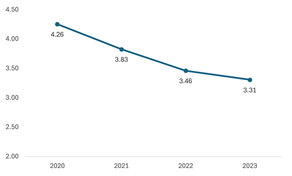 At a glance, Indonesian macroeconomic indicators appear to be performing relatively well. For instance, Indonesia recorded an economic growth of 5.02 percent in 2024, higher than other developing economies like Brazil (3.6 percent), Thailand (3.2 percent), South Africa (0.9 percent), and Mexico (0.5 percent), according to Trading Economics. After the pandemic, Indonesia has also enjoyed relatively increasing and stable economic growth, gradually recovering from the pandemic in 2020 that hit economic growth to a level of -2.07 percent, according to World Bank data (Figure 1). Furthermore, the unemployment rate also shows a seemingly desirable performance with a declining trend from 4.26 percent of the total labor force in 2020 to 3.31 percent in 2023 (Figure 2).
