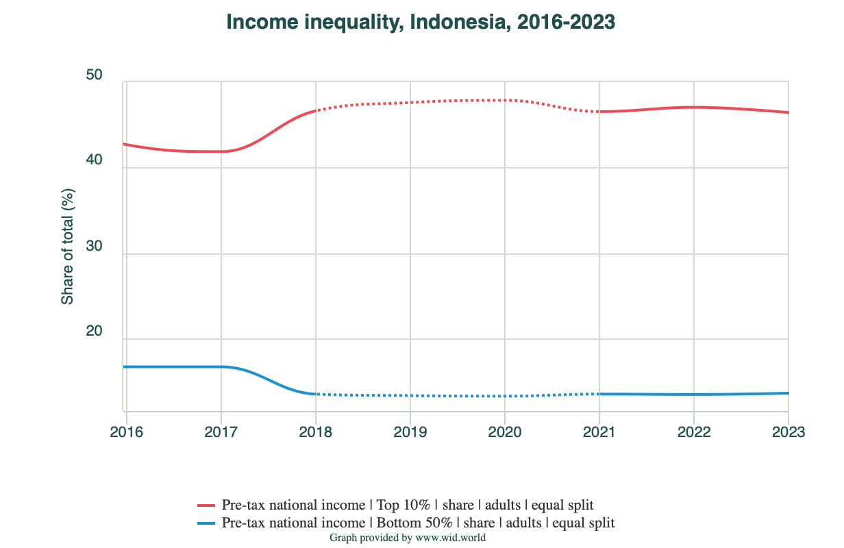 Figure 4. Indonesian Gini Coefficient (left) and Income Inequality (right). Source: World Development Indicators, World Inequality Database.