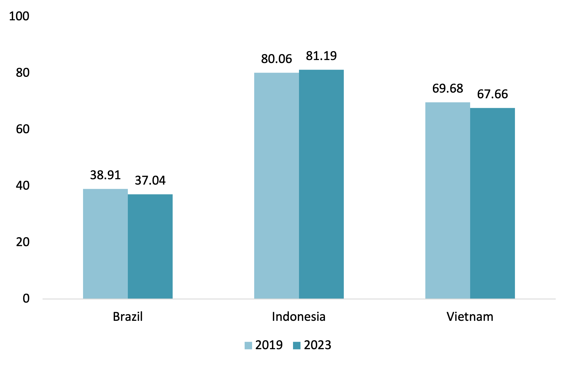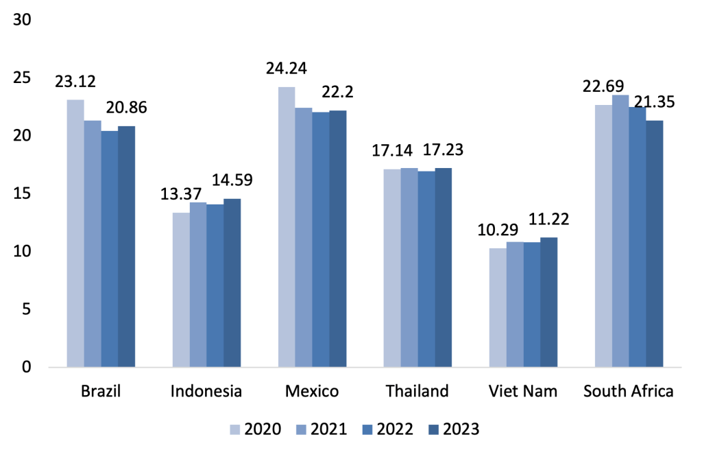 Moreover, the structural issue behind the lower purchasing power could occur even when the unemployment rate has declined. One possible reason might be attributed to the labor force shift from the formal to the informal sector. Statistics Indonesia through Sakernas recorded a substantial growth of approximately 2.5 times in the net new jobs in the informal sector in 2018-2023 relative to the previous period of 2013-2018, while new jobs in the formal sector were degraded considerably by 63.14 percent. Meanwhile, compared to other developing economies like Brazil and Vietnam, Indonesia not only has a larger portion of informal sector employment but also exhibits positive growth in 2023 compared to the rate in 2019 before the pandemic (Figure 6). Informality might be a considerable issue as informal firms operate entirely outside the formal economy, conducting all transactions in cash—whether hiring workers, purchasing inputs, or selling products. They remain persistently informal, exhibit extremely low productivity, and gain little from transitioning to formal status (La Porta & Shleifer, 2014).